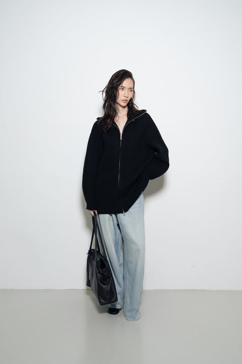 Unisex 拉鍊設計羊毛針織大外套 (黑)