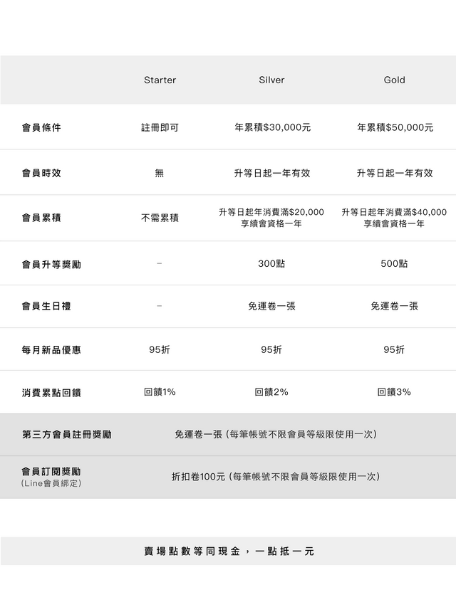 ・Starter會員:每消費NT$100,回饋購物金1元。